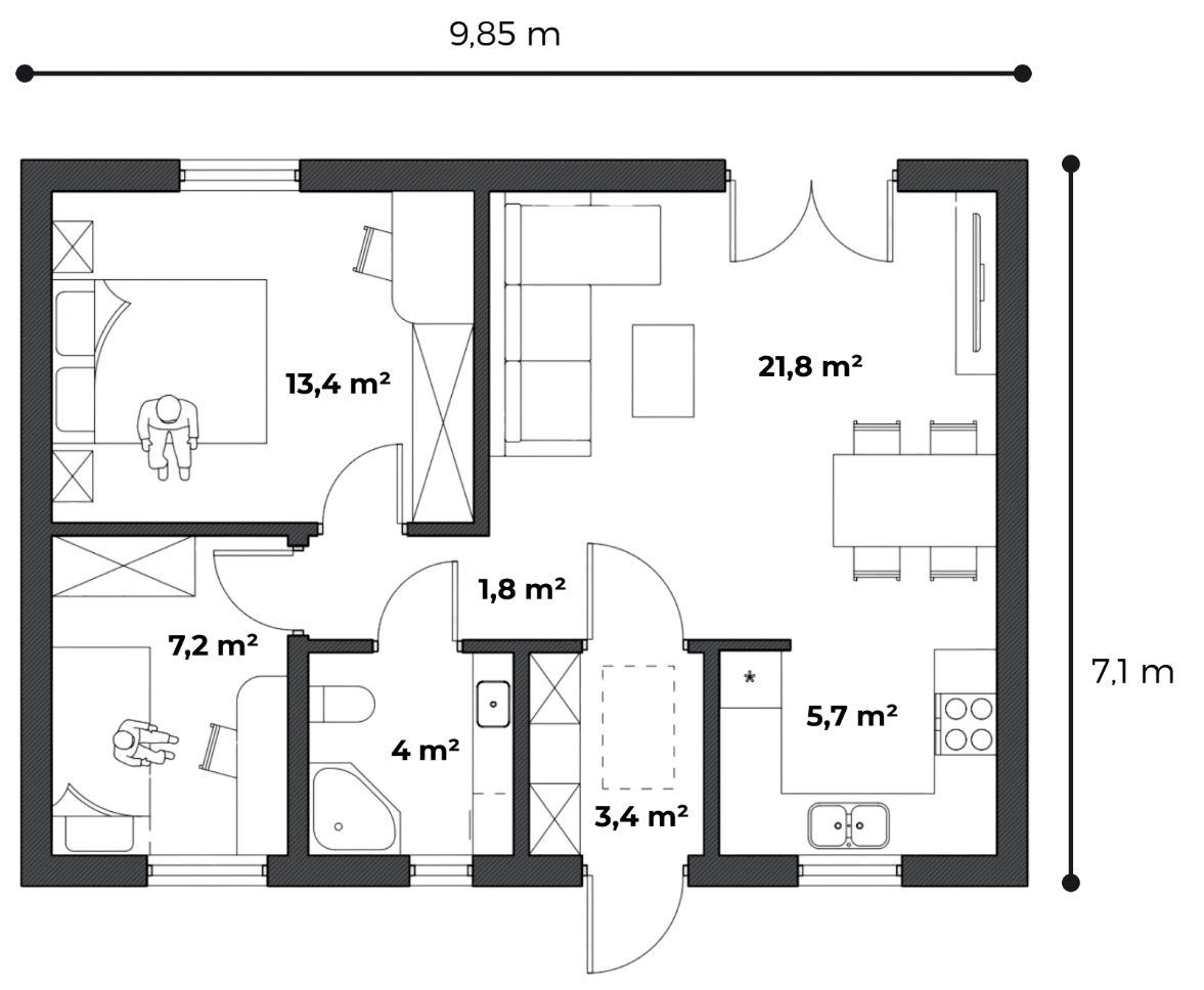 Wnętrze zostało maksymalnie zoptymalizowane pod względem funkcjonalności, oferując przestronną strefę dzienną z otwartą kuchnią, elastyczny układ sypialni i możliwość aranżacji antresoli, a duże okna i taras dodatkowo powiększają przestrzeń wypoczynkową.